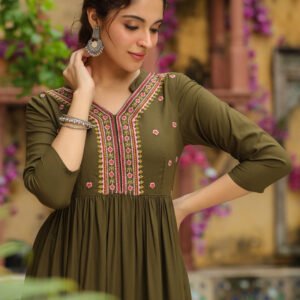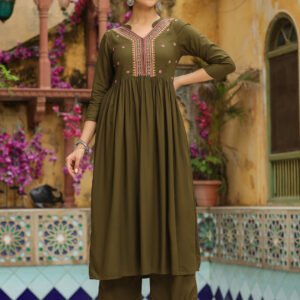Olive Green Rayon A-Line Kurta Set with Embroidered Yoking