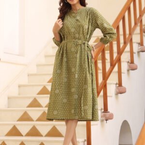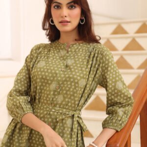 Olive Green Pure Cotton Floral Printed Angrakha Dress