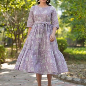 Lavender Pure Cotton Floral Printed Tiered Dress