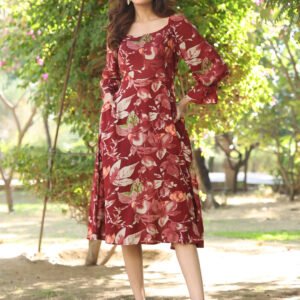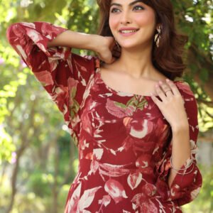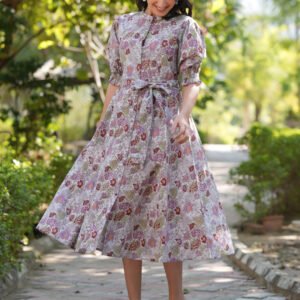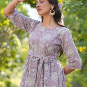 Mauve Pure Cotton Floral Printed Gathered Dress