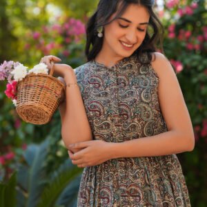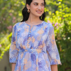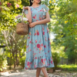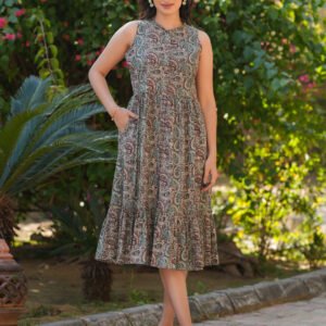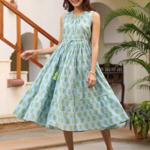 Light Blue Pure Cotton Paisley Printed Tiered Dress