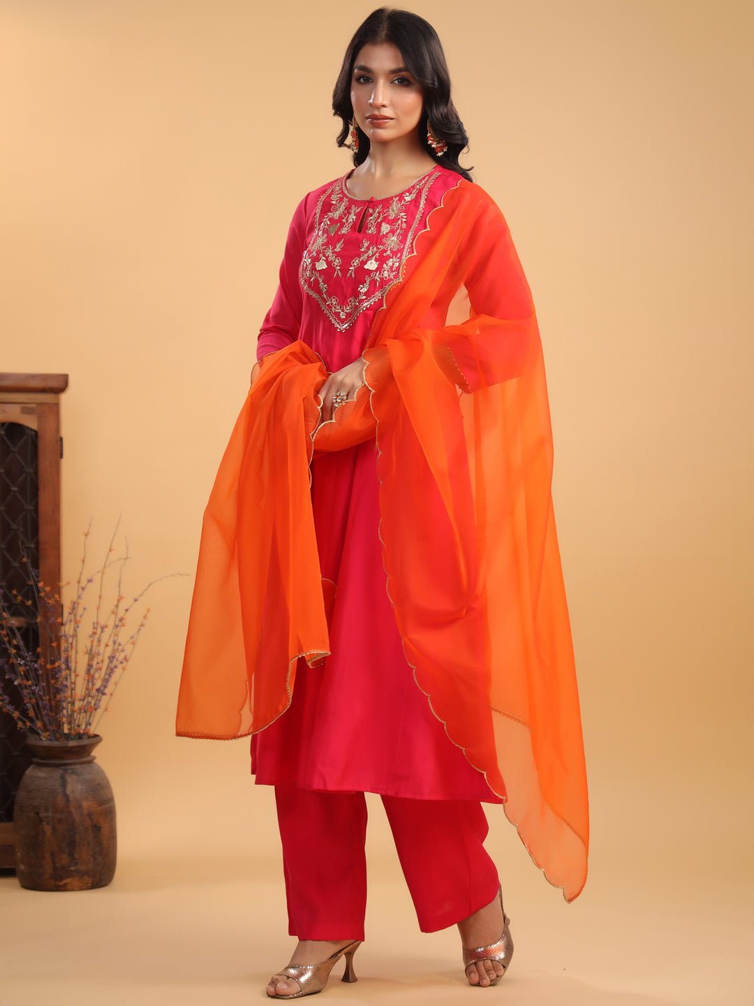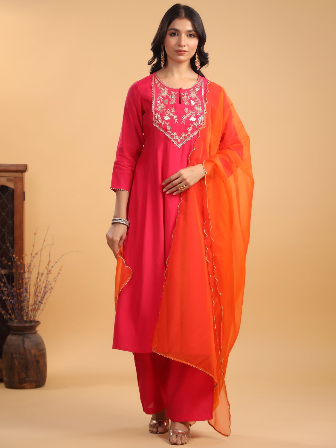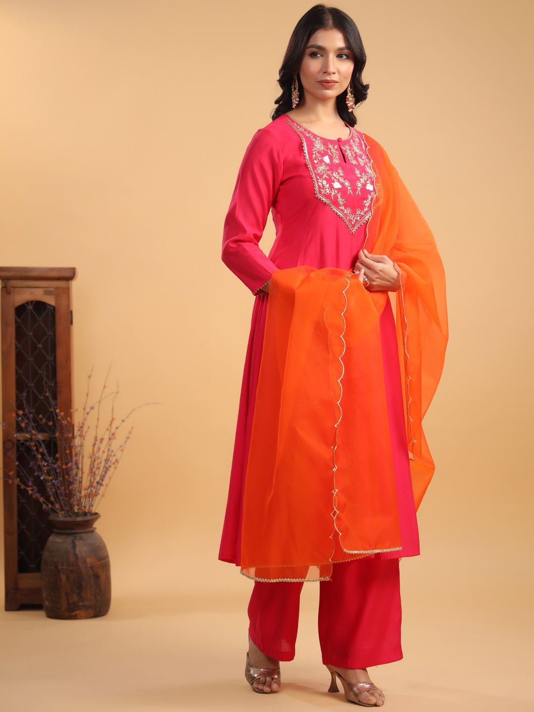 - Embrace Elegance With Janasya’S Pink Chanderi Yoke Embroidered Anarkali Kurta Set. Crafted From Luxurious Chanderi Fabric, This Stunning Anarkali Features Intricate Zari Embroidery On The Yoke, Elevating Its Festive Charm. The Keyhole Neckline Adds A Sophisticated Touch, Making It Perfect For Special Occasions. Paired With Matching Pink Straight Bottoms And A Contrasting Orange Organza Dupatta, This Ensemble Brings Together Vibrant Colors And Intricate Detailing, Offering A Graceful Yet Bold Look That’S Sure To Turn Heads.
