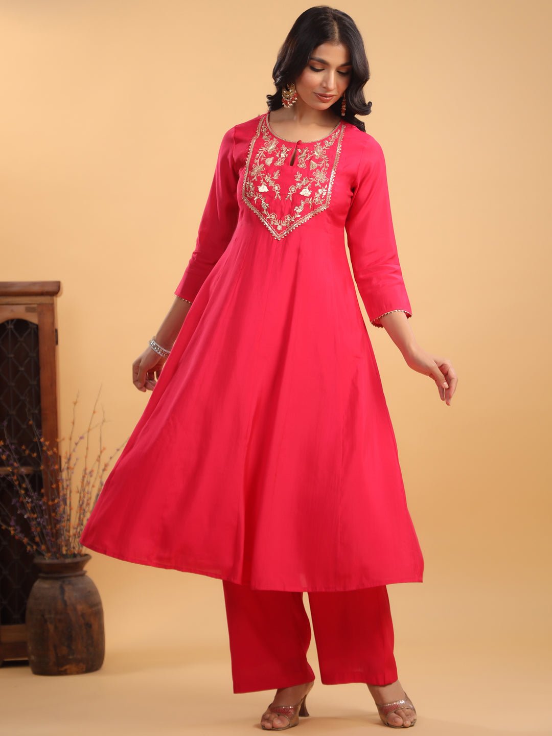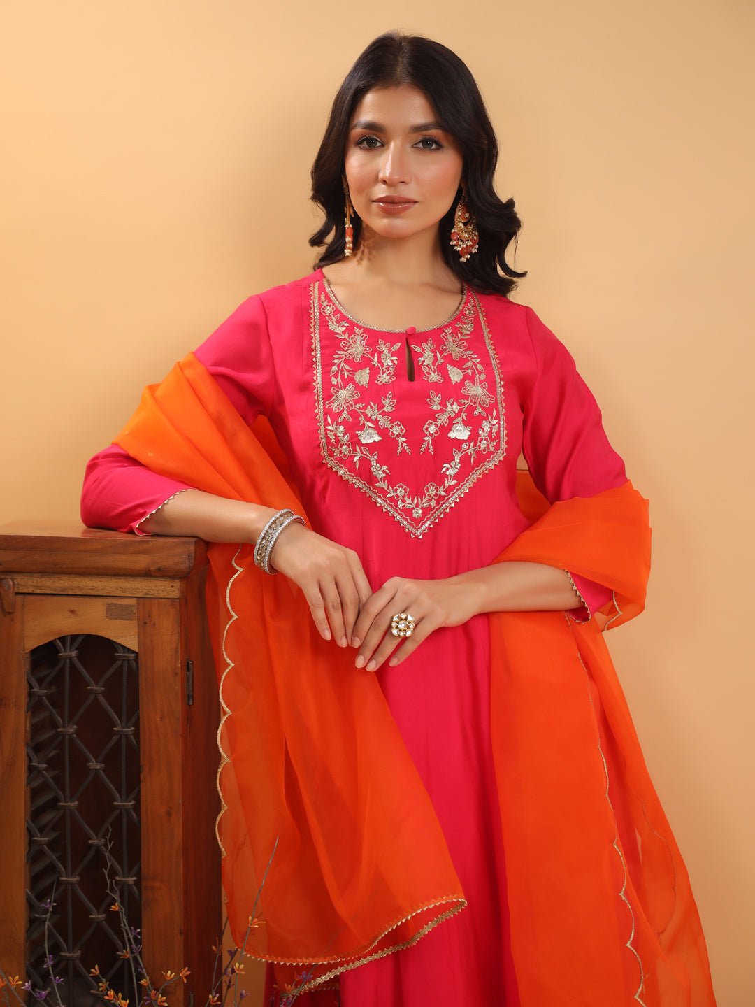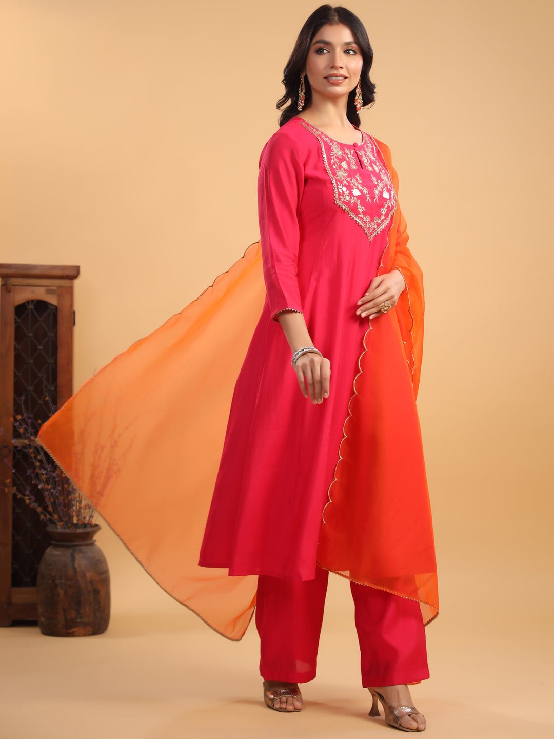 - Embrace Elegance With Janasya’S Pink Chanderi Yoke Embroidered Anarkali Kurta Set. Crafted From Luxurious Chanderi Fabric, This Stunning Anarkali Features Intricate Zari Embroidery On The Yoke, Elevating Its Festive Charm. The Keyhole Neckline Adds A Sophisticated Touch, Making It Perfect For Special Occasions. Paired With Matching Pink Straight Bottoms And A Contrasting Orange Organza Dupatta, This Ensemble Brings Together Vibrant Colors And Intricate Detailing, Offering A Graceful Yet Bold Look That’S Sure To Turn Heads.
