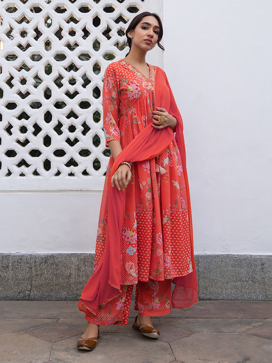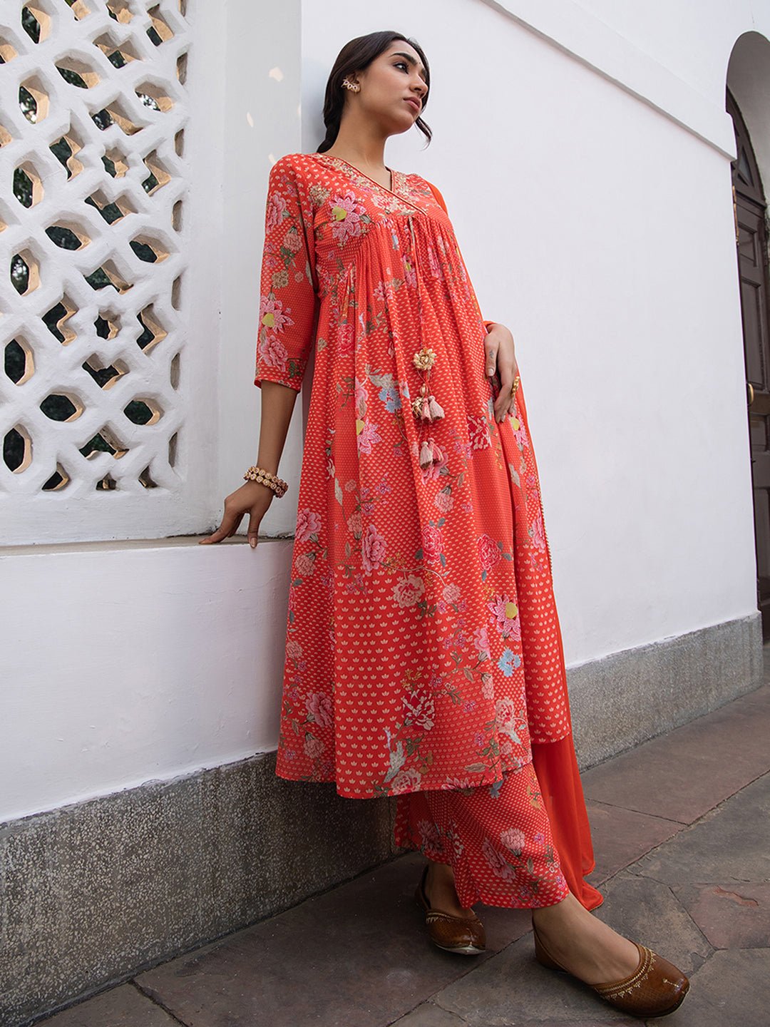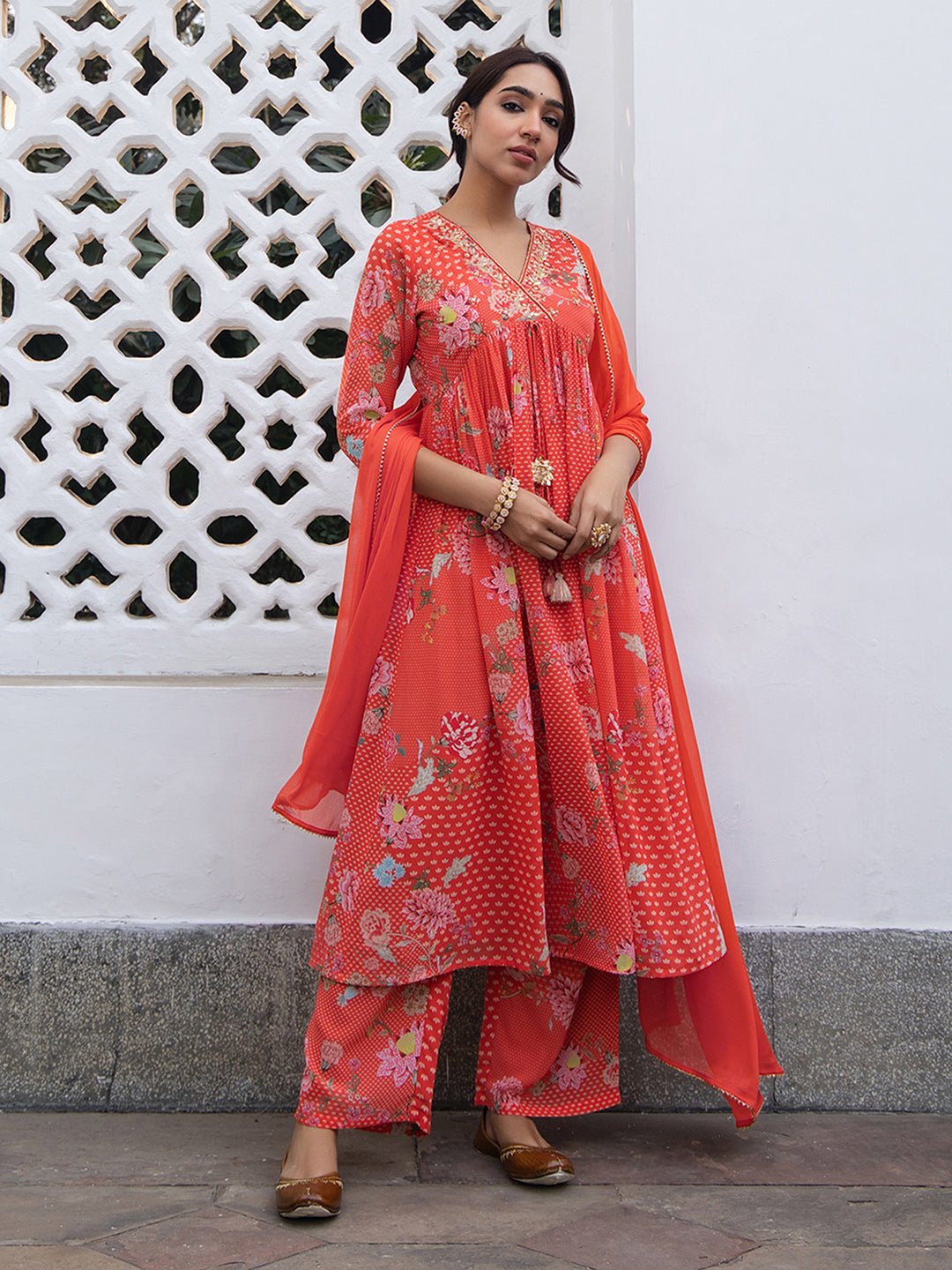 • Revitalize your wardrobe with the pleated red georgette mix and match kurta set, an elegant ethnic elegance and contemporary flair. The embroidered floral pattern with gathers adds a touch of sophistication to the redhue, making it a versatile piece for various occasions. The kurta features the V-neck and floral embroidered details that bring a hint of charm and grace. Paired with straight palazzo pants and solid dupatta making you stand out embracing the beauty of the set elevatating your style effortlessly.