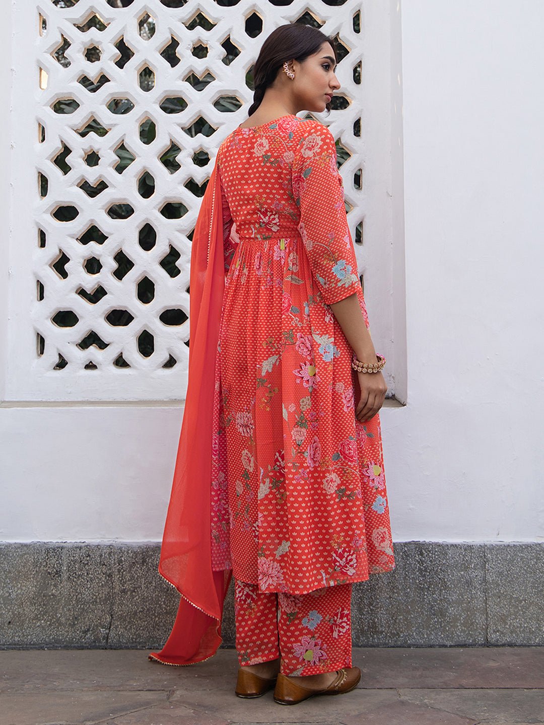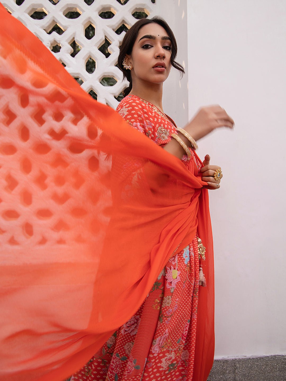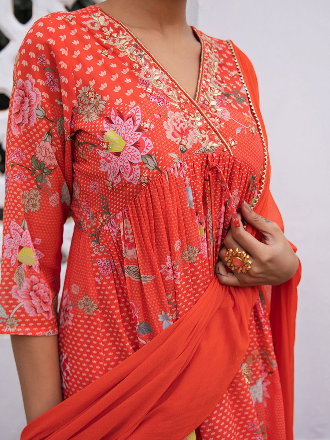 • Revitalize your wardrobe with the pleated red georgette mix and match kurta set, an elegant ethnic elegance and contemporary flair. The embroidered floral pattern with gathers adds a touch of sophistication to the redhue, making it a versatile piece for various occasions. The kurta features the V-neck and floral embroidered details that bring a hint of charm and grace. Paired with straight palazzo pants and solid dupatta making you stand out embracing the beauty of the set elevatating your style effortlessly.