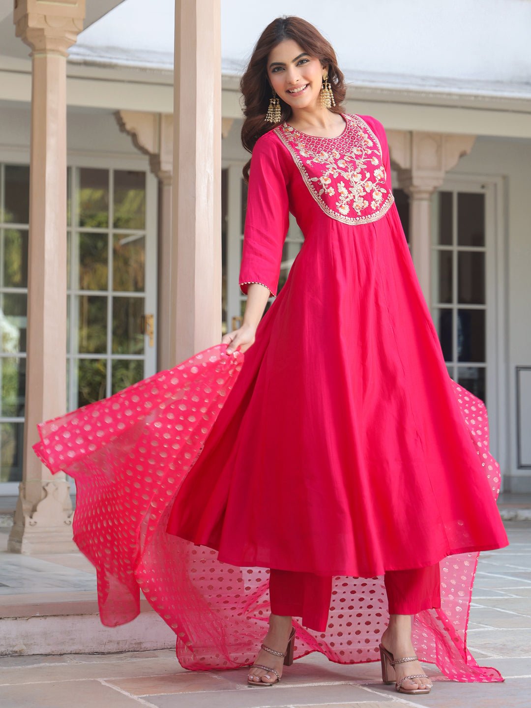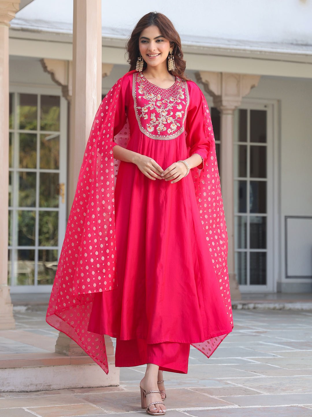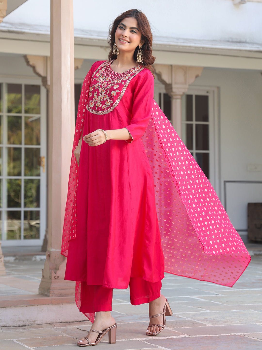 - The pink chanderi silk yoke embroidered anarkali kurta set with dupatta is a perfect blend of elegance and tradition. The anarkali features an intricate yoke-embroidered patch, beautifully complemented by a round neck and button & loop closure at the back. The flared kali design adds graceful flow, paired seamlessly with matching straight pants. The highlight of the outfit is the stunning pink organza jacquard dupatta, adding a touch of glamour and bling, making this ensemble perfect for any festive occasion.