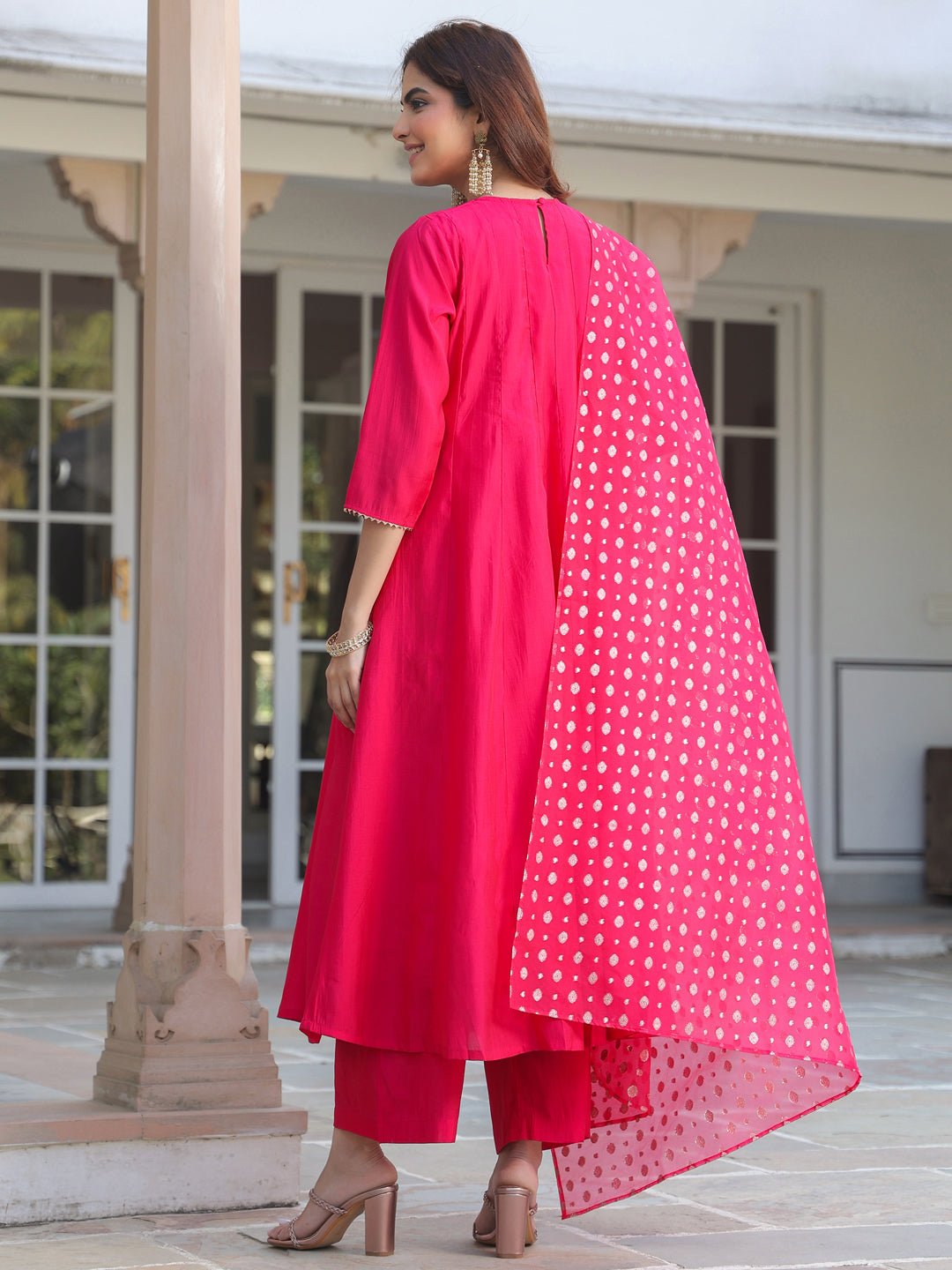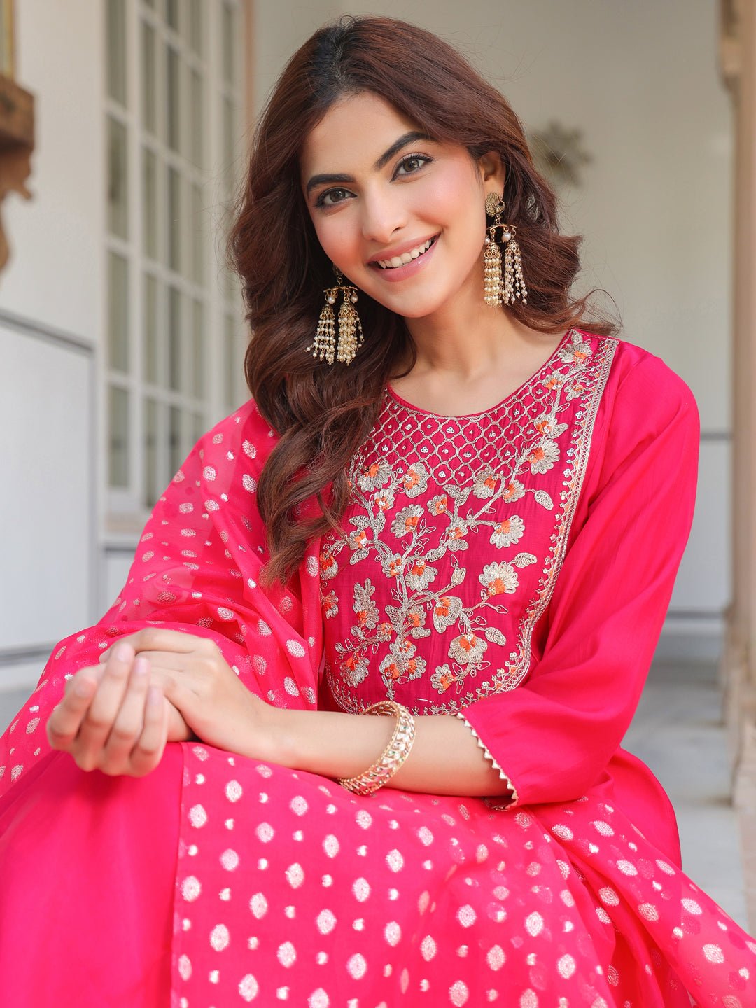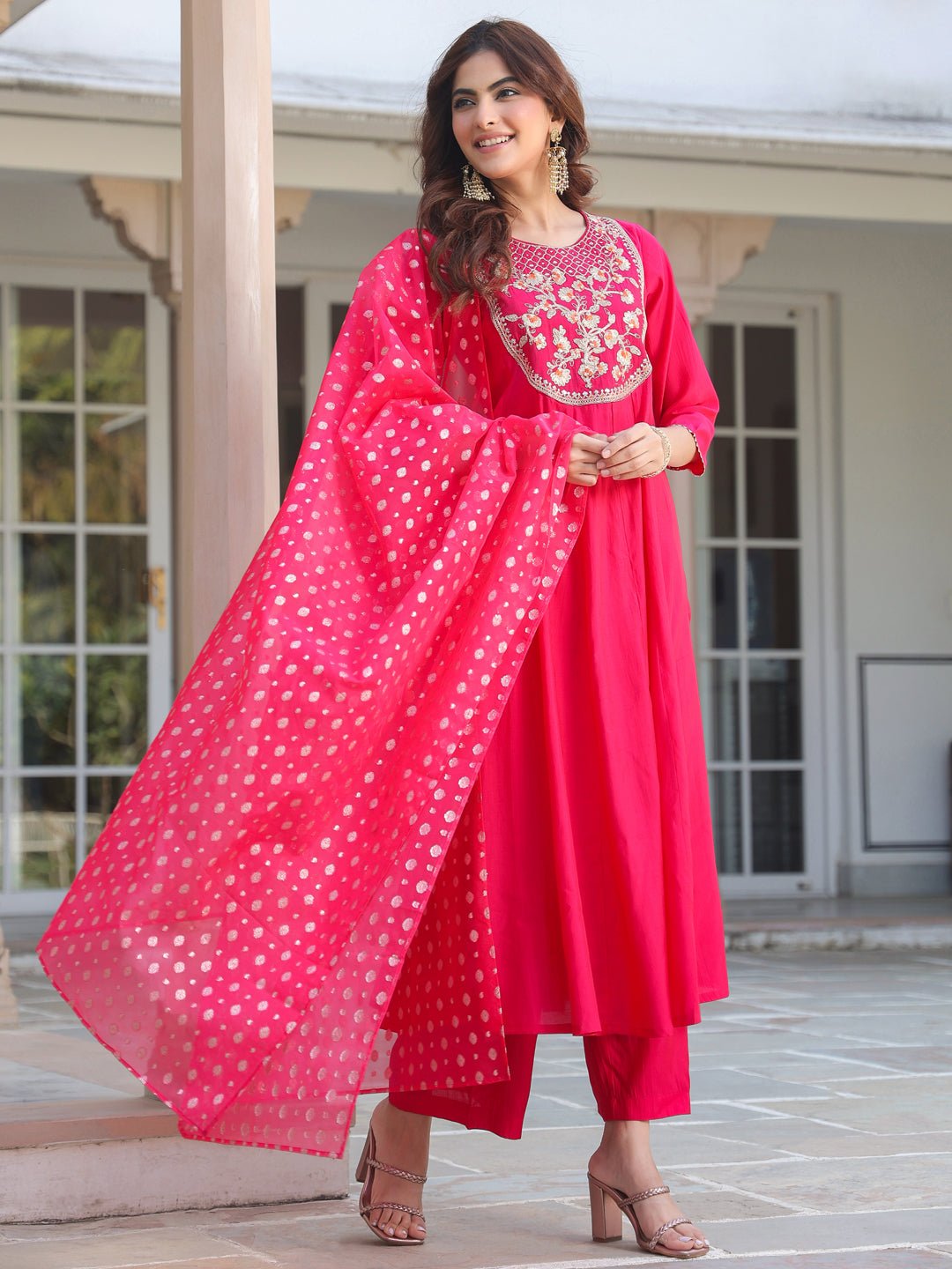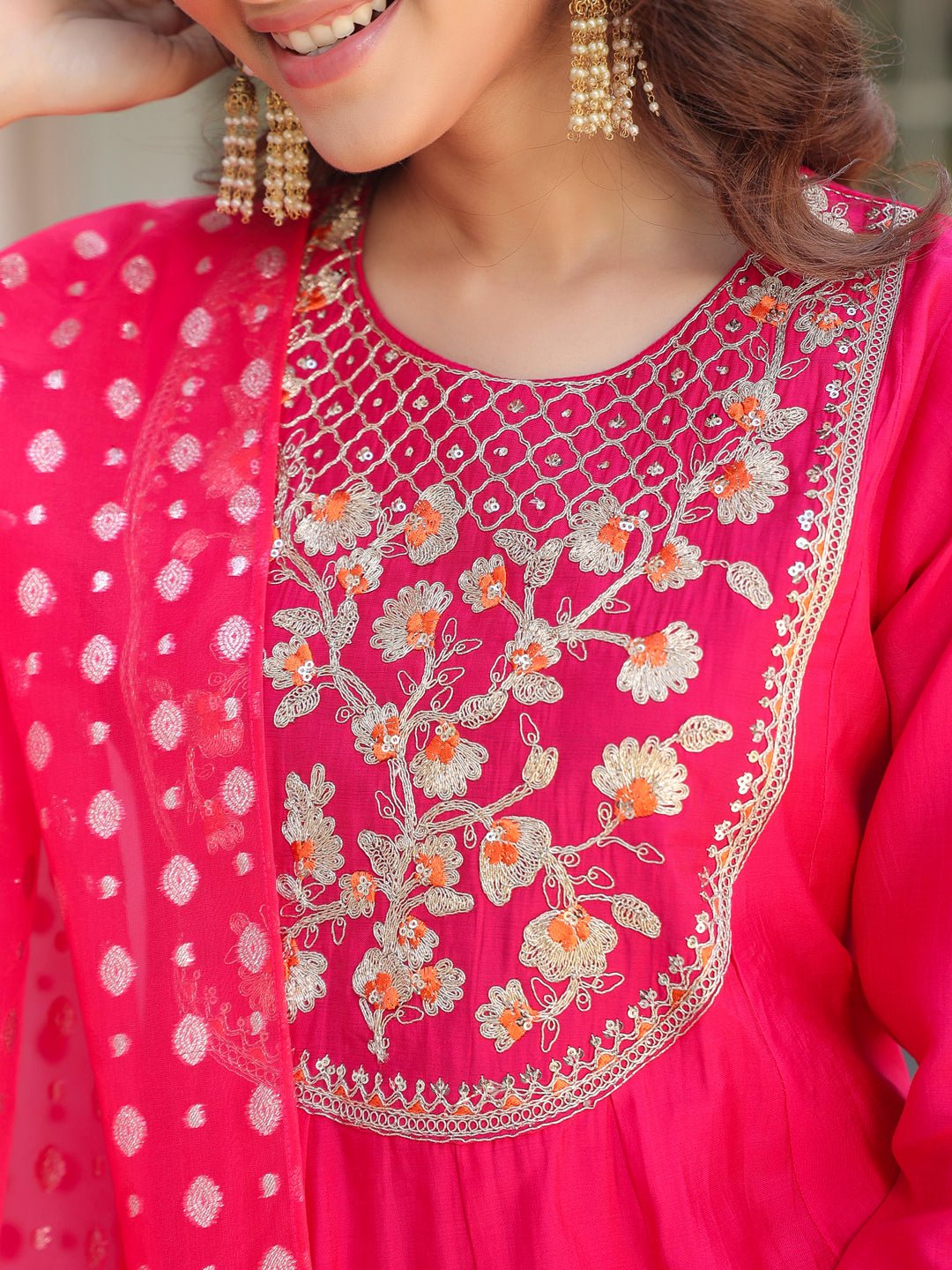 - The pink chanderi silk yoke embroidered anarkali kurta set with dupatta is a perfect blend of elegance and tradition. The anarkali features an intricate yoke-embroidered patch, beautifully complemented by a round neck and button & loop closure at the back. The flared kali design adds graceful flow, paired seamlessly with matching straight pants. The highlight of the outfit is the stunning pink organza jacquard dupatta, adding a touch of glamour and bling, making this ensemble perfect for any festive occasion.