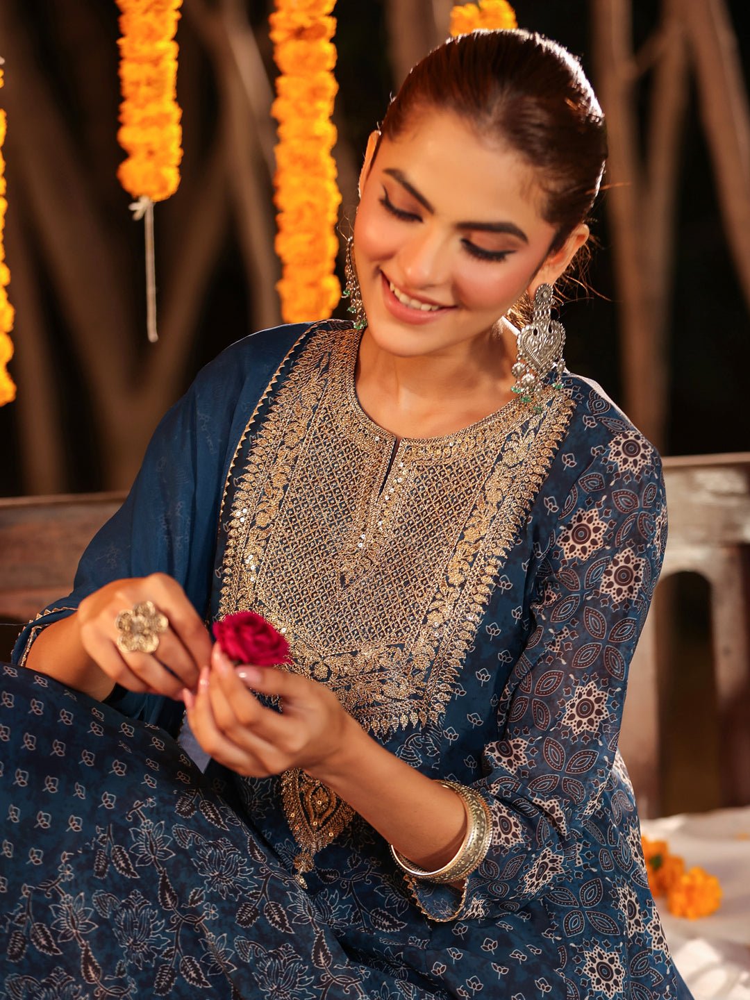 - Make an effortless statement in this dark blue georgette anarkali kurta set. The kurta features an intricate gold zari and sequin embroidered yoke, accentuated with a keyhole neckline and ornate detailing that adds a regal charm. The body of the kurta showcases rich ethnic motifs print, blending traditional craftsmanship with a modern silhouette. The set is completed with matching straight-fit bottoms in printed georgette for a coordinated look. Paired with a solid chiffon dupatta edged with subtle gota patti detailing, this ensemble is perfect for festive soirées, family gatherings, and elegant evening affairs.
