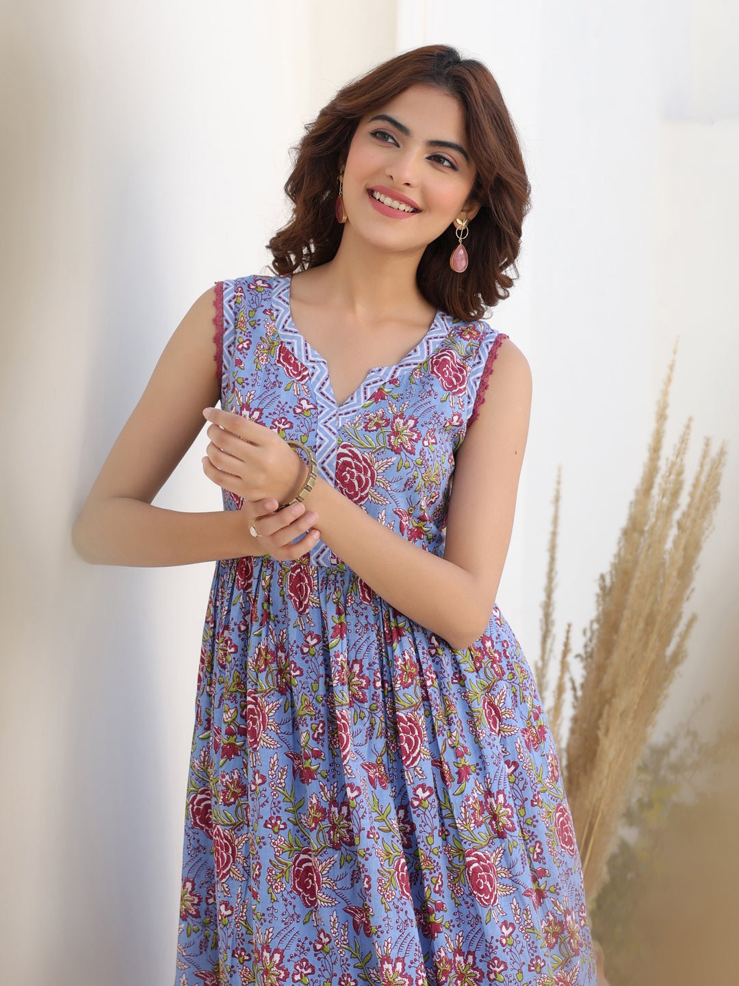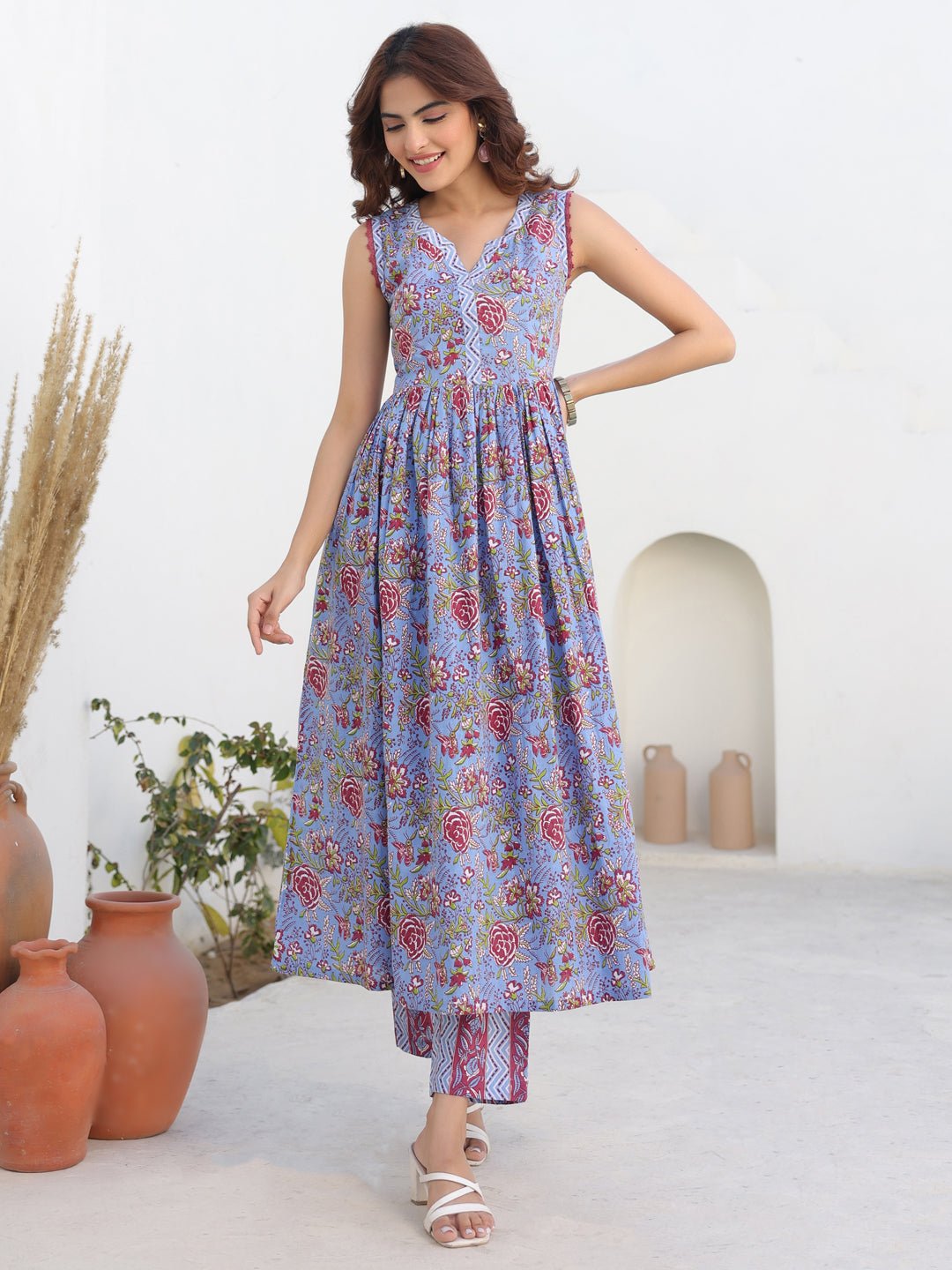 - Step into effortless summer chic with this pure cotton blue floral a-line kurta bottom set. Crafted in pure cotton, the sleeveless kurta features delicate cotton lace on the sleeveless hem, soft gathers at the waist for a flattering silhouette, and a stylish notch neck. Designed for everyday ease with a side pocket and cotton coordinated printed straight pants, this set blends comfort and charm. Perfect for your casual wardrobe.