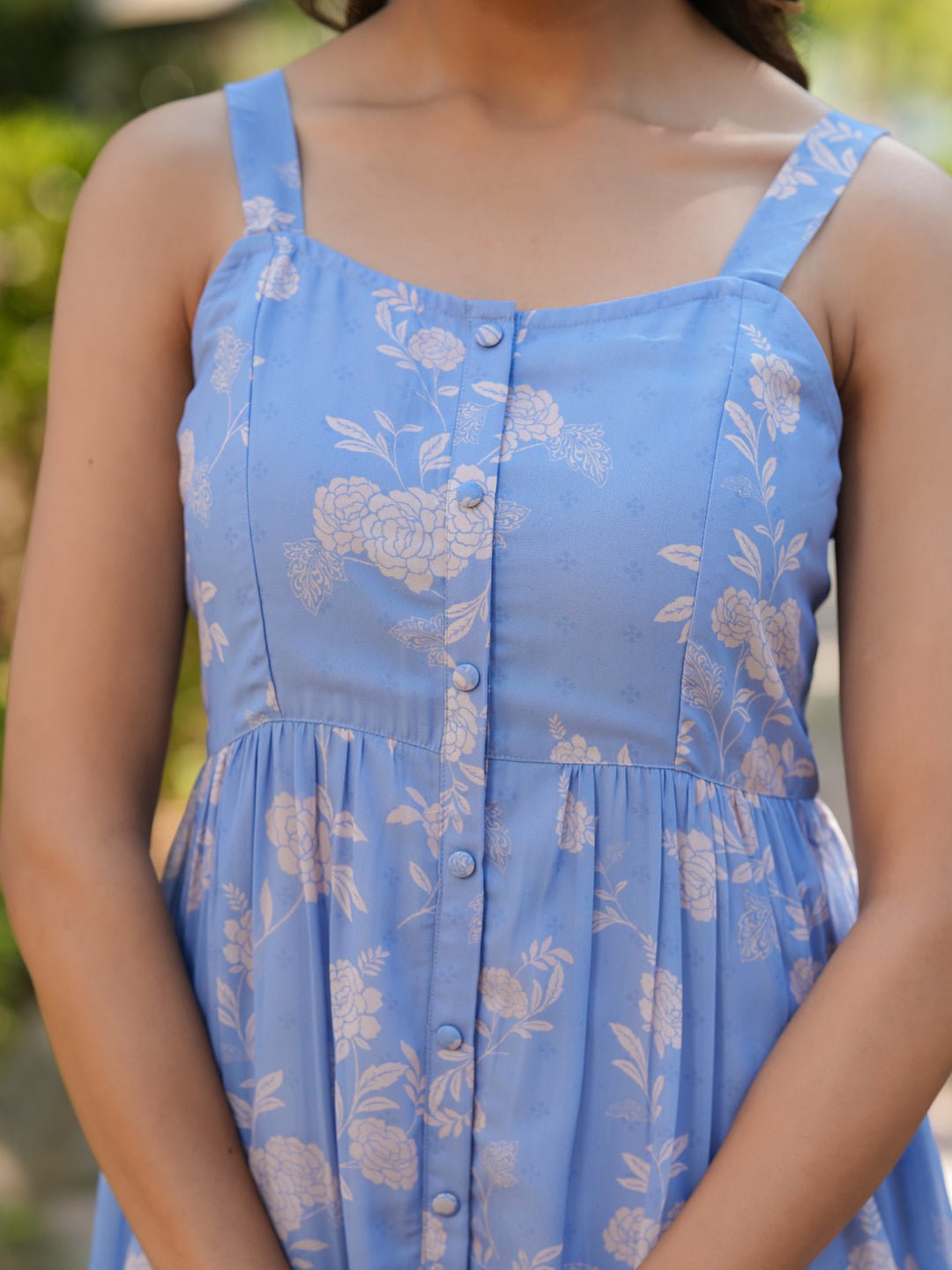 - This blue georgette floral printed tiered dress is a fresh and casual choice. Featuring a sleeveless design with delicate smocking on the back, it’s adorned with button ornamentation down the front. The waist adds a flattering cinching effect, while the beige floral prints, tiered skirt and front slit complete the breezy, relaxed look. Perfect for casual outings.