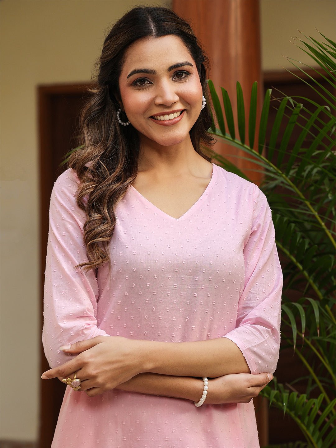 This light pink dobby cotton a-line co-ord set is the perfect blend of elegance and ease. The kurta features a flattering v-neck, a flowy a-line silhouette that drapes beautifully, and a functional side pocket for added convenience. Paired with matching straight pants, this ensemble ensures a chic yet comfortable look. Both pieces are lined with soft mull, making it an ideal choice for all-day wear.