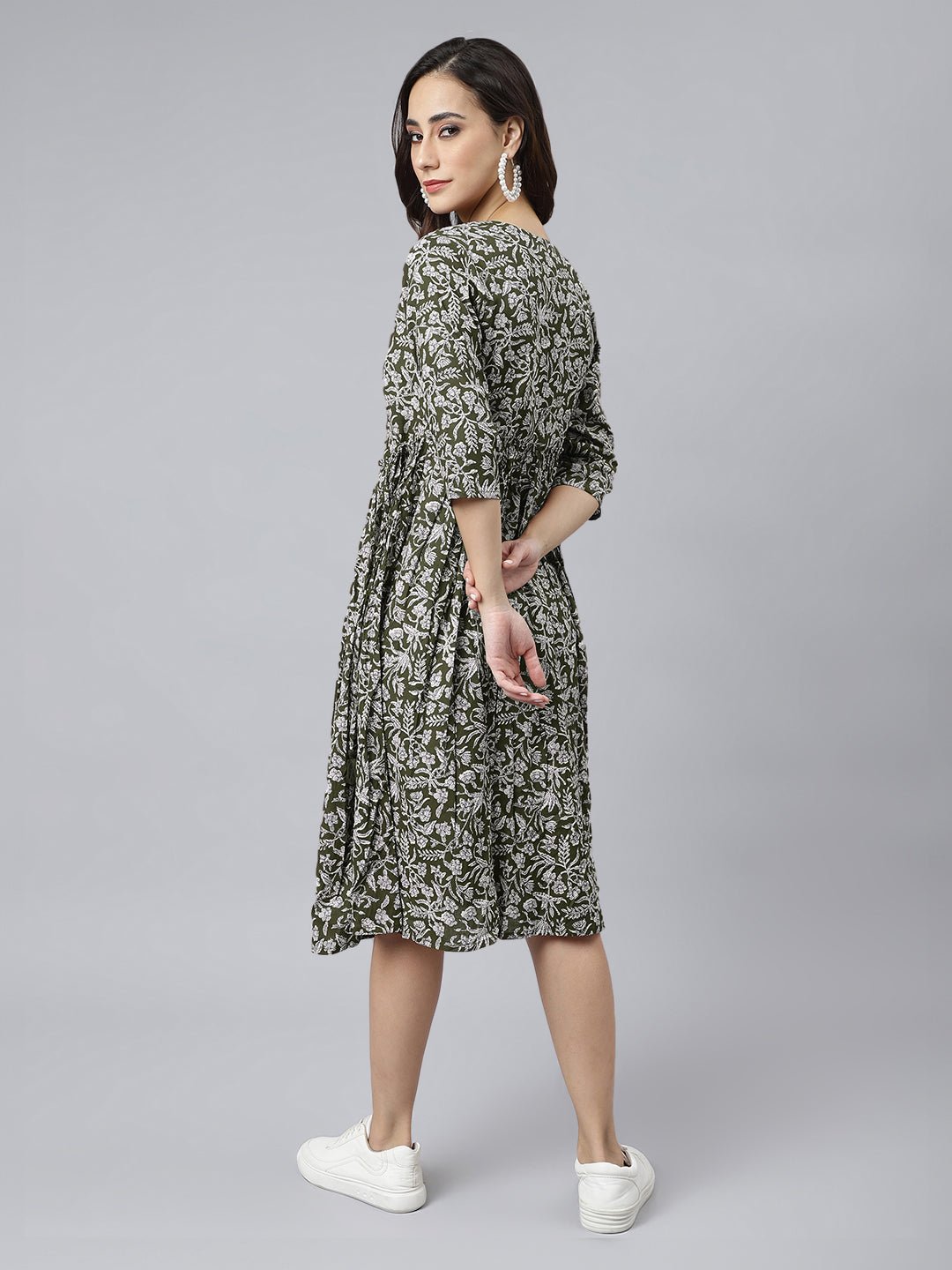 - Embrace effortless charm with Janasya’s Olive Cotton Angrakha Dress. Highlighted by a wrap neck and delicate white floral prints, it exudes grace with a timeless appeal. The waist tie-up closure adds a flattering silhouette, while subtle ruffles on the waist enhance its feminine allure. Perfect for chic, everyday elegance.