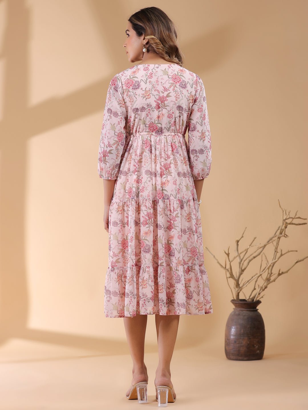 - Turn heads at your next outing with this pink georgette floral printed tiered dress. Featuring a v-neckline, balloon sleeves, and delicate button ornamentation, it offers a blend of elegance and comfort. The waist tie-up and tiered design create a flattering silhouette, while the multi-colored floral prints add a playful touch. Fully lined with butter crepe, it’s the perfect pick for a chic picnic look.
