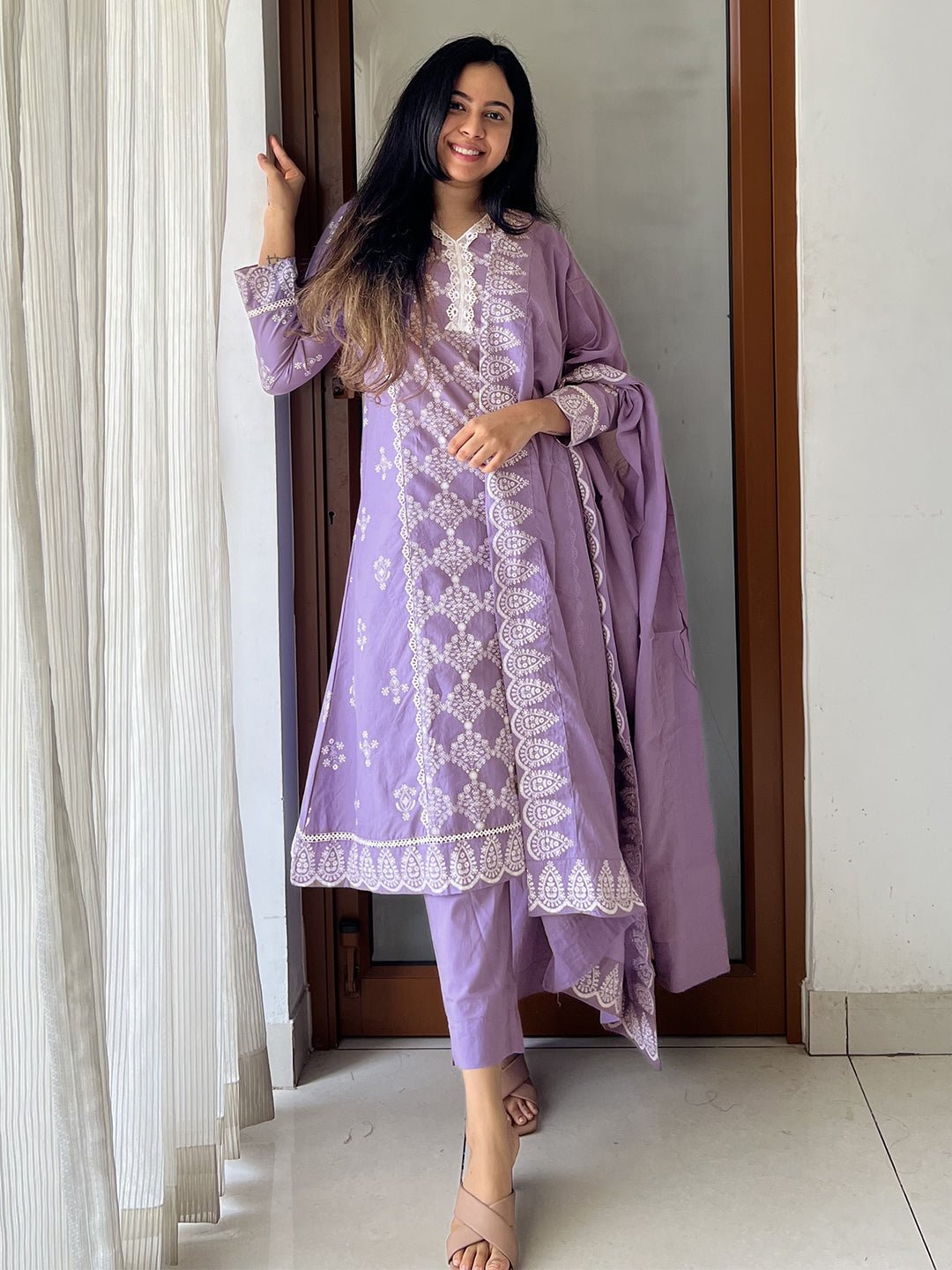 - Step into effortless elegance with this lavender cotton a-line kurta set, perfect for your everyday and festive moments. Crafted in breathable cotton, the kurta features intricate white lace detailing along the neckline, hem, and sleeves, adding a soft feminine touch. The set includes narrow-fit pants and a matching dupatta with delicate lace borders. Pair with silver jhumkas and white heels for a breezy ethnic glam look.